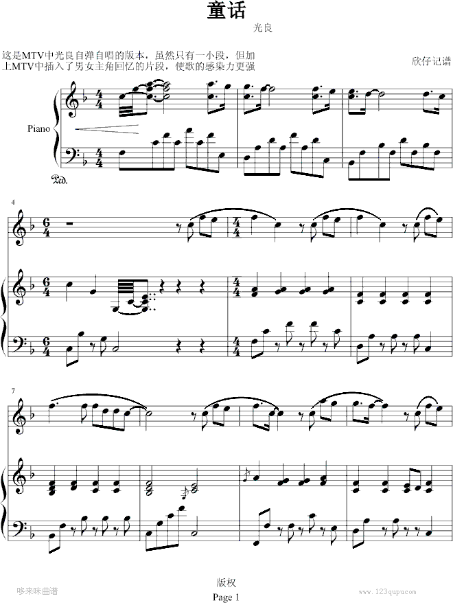 [钢琴谱]童话-弹唱纯钢琴版 光良
