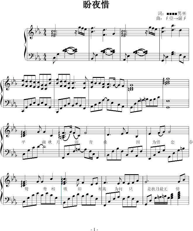 [钢琴谱]盼夜惜 ∮亞→薩∮