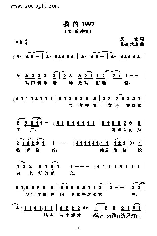 [其他乐谱]我的1997 歌曲类 简谱 艾敬