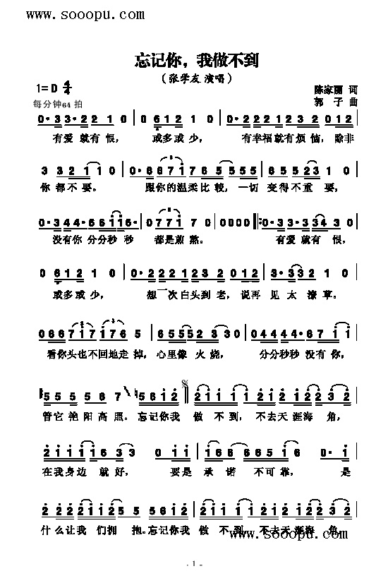 [其他乐谱]忘记你我做不到 歌曲类 简谱 张学友