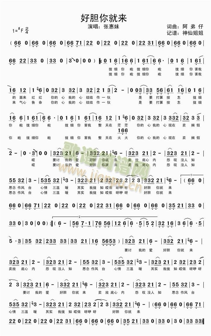 [五字歌谱]好胆你就来 闽南语 张惠妹