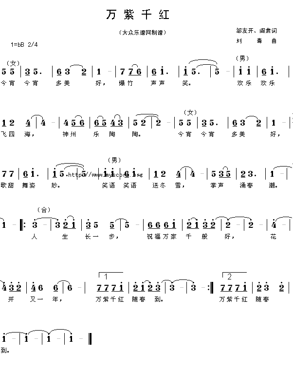 [四字歌谱]歌曲:万紫千红(邹友开、阎肃词 刘青曲 简谱)