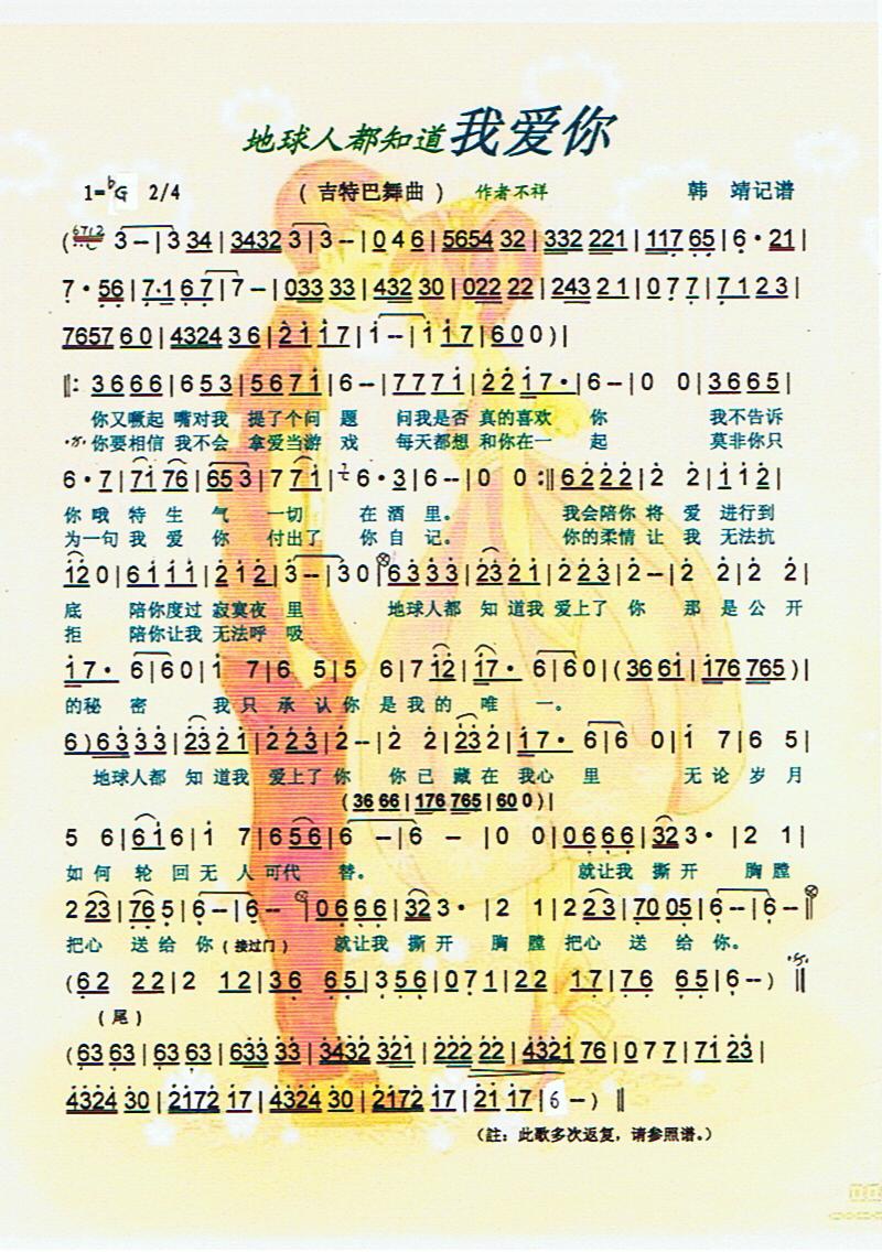 当前位置: 歌谱简谱网 > 十字及以上 > 地球人都知道我爱你【彩谱】