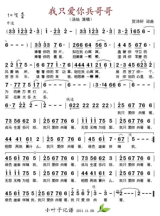 [七字歌谱]我只爱你兵哥哥 汤灿
