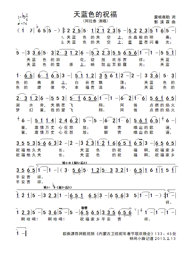 [六字歌谱]天蓝色的祝福 阿拉泰