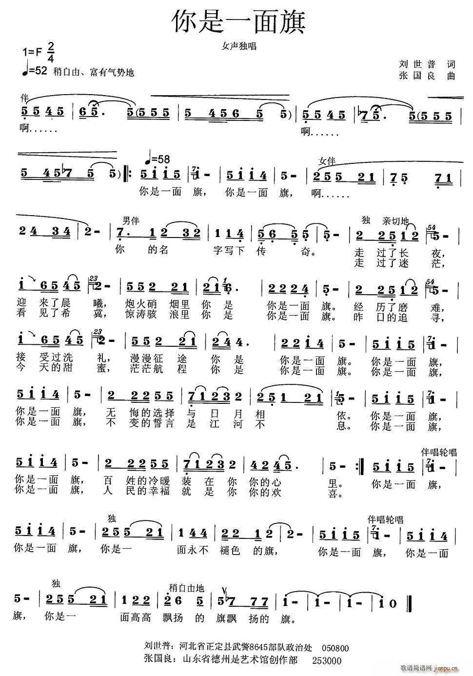 当前位置: 歌谱简谱网 > 五字歌谱 > 你是一面旗(刘世普词 张国良曲)