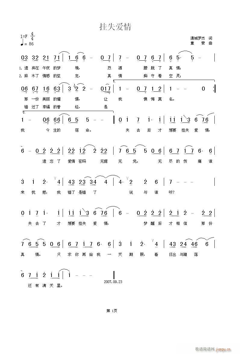 [四字歌谱][通俗] 《挂失爱情》 作词:通城罗杰