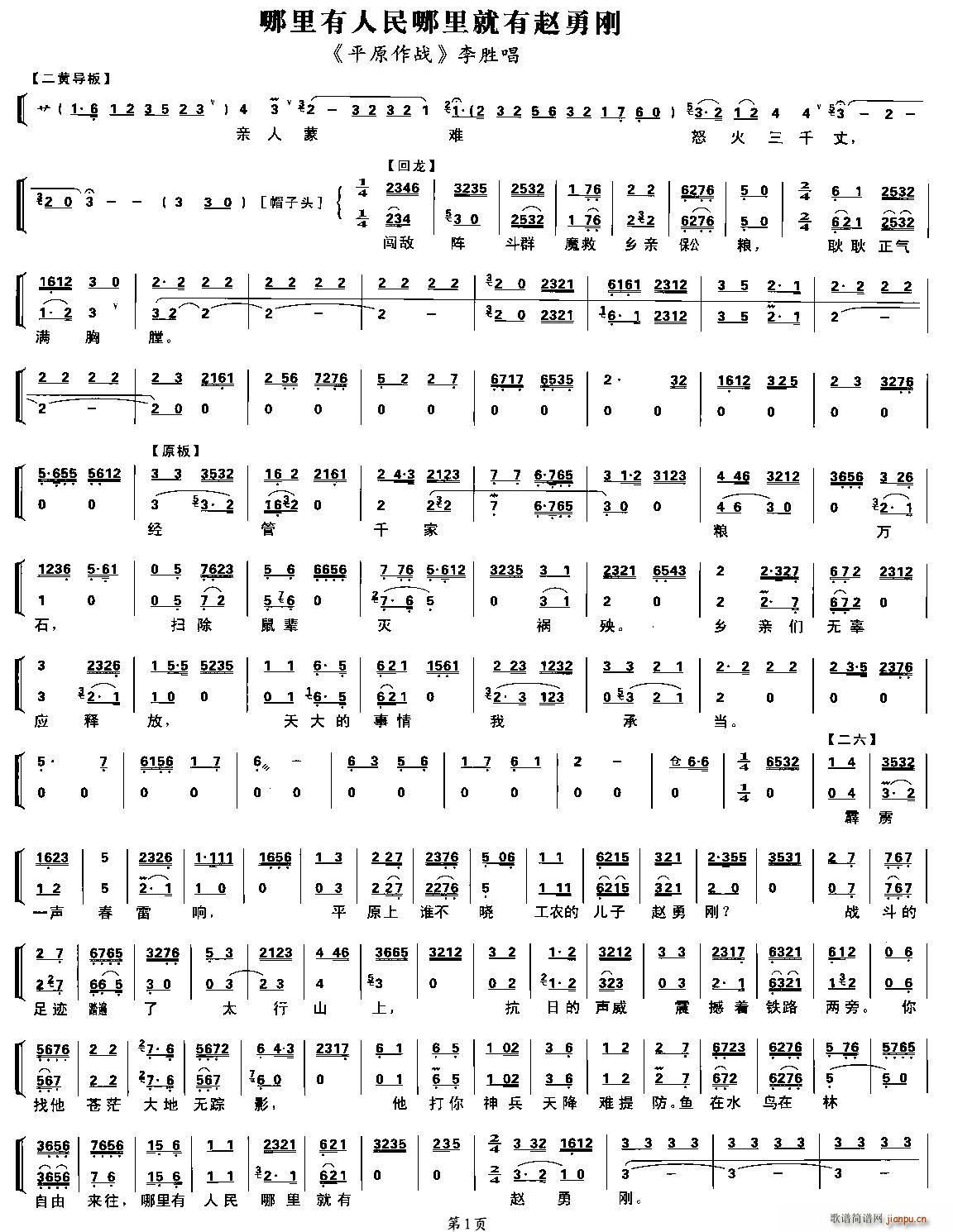 [十字及以上]哪里有人民哪里就有赵勇刚(《平原作战》李胜唱段、琴谱)