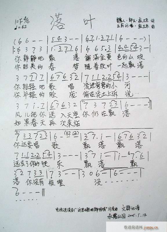 [八字歌谱]落叶(《这里的黎明静悄悄》主题曲、五线谱/简谱对照)王莉-女歌手