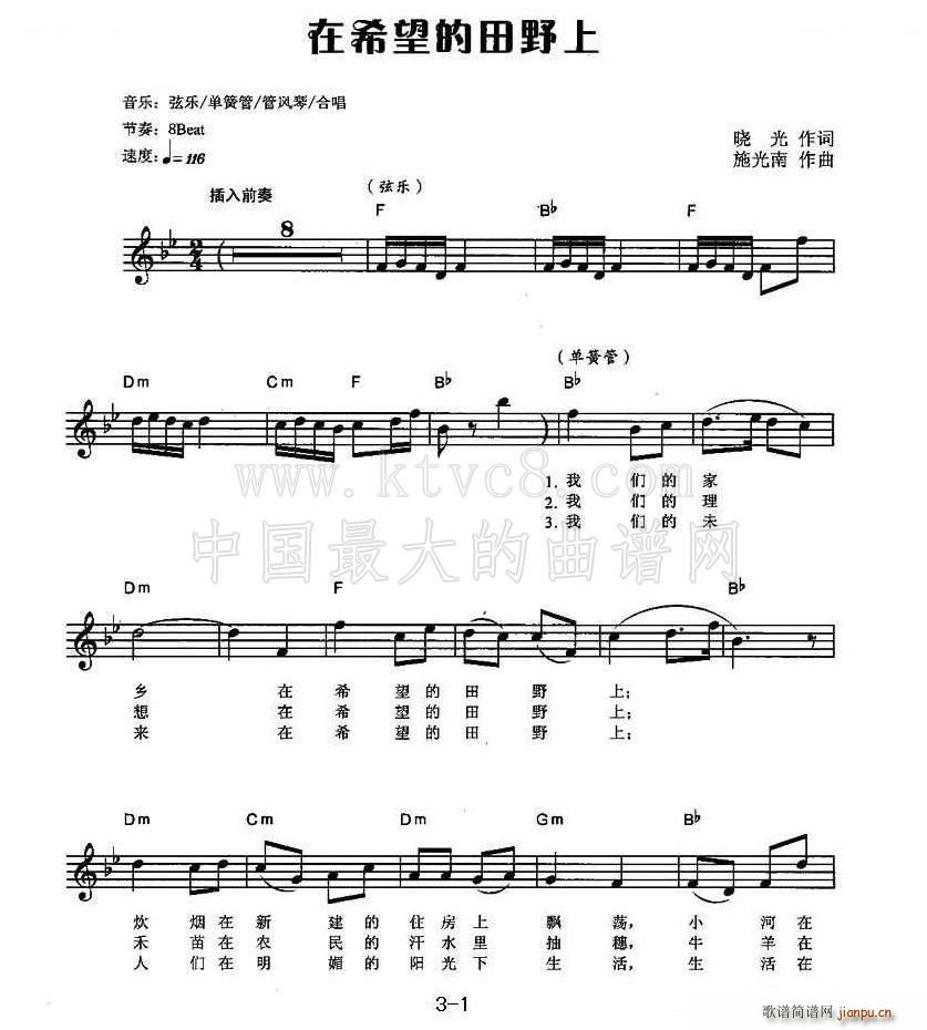 [七字歌谱]在希望的田野上[合唱曲谱] 未知