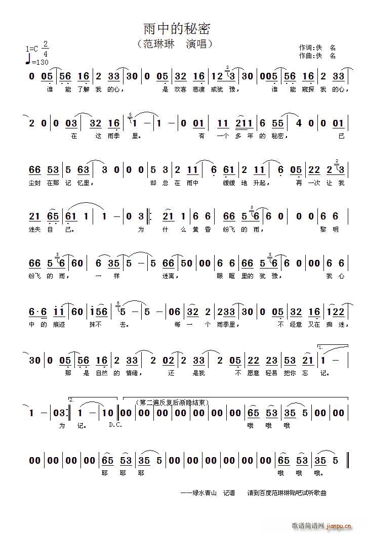 [五字歌谱]雨中的秘密 范琳琳