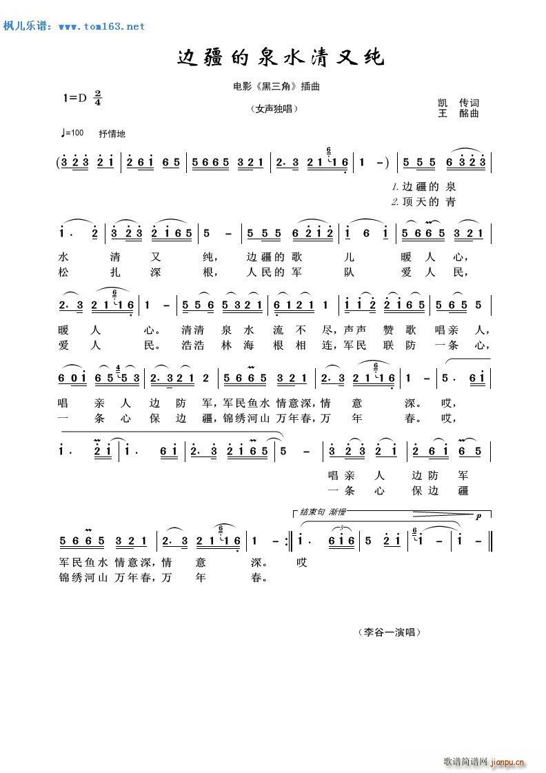 [其他乐谱]边疆的泉水清又纯 歌曲类 简谱 凯传王酩