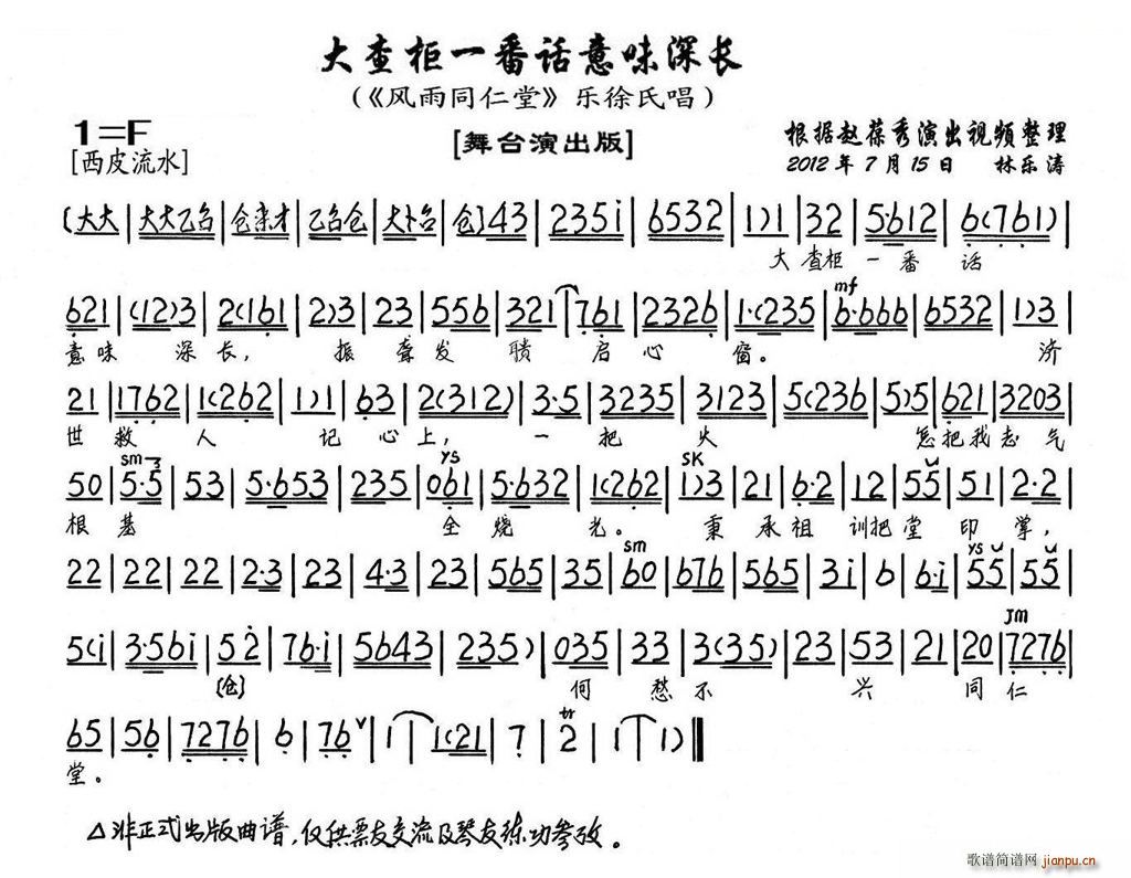 [京剧曲谱]大查柜一番话意味深长(《风雨同仁堂》 唱段、琴谱) 京剧唱谱 乐徐氏