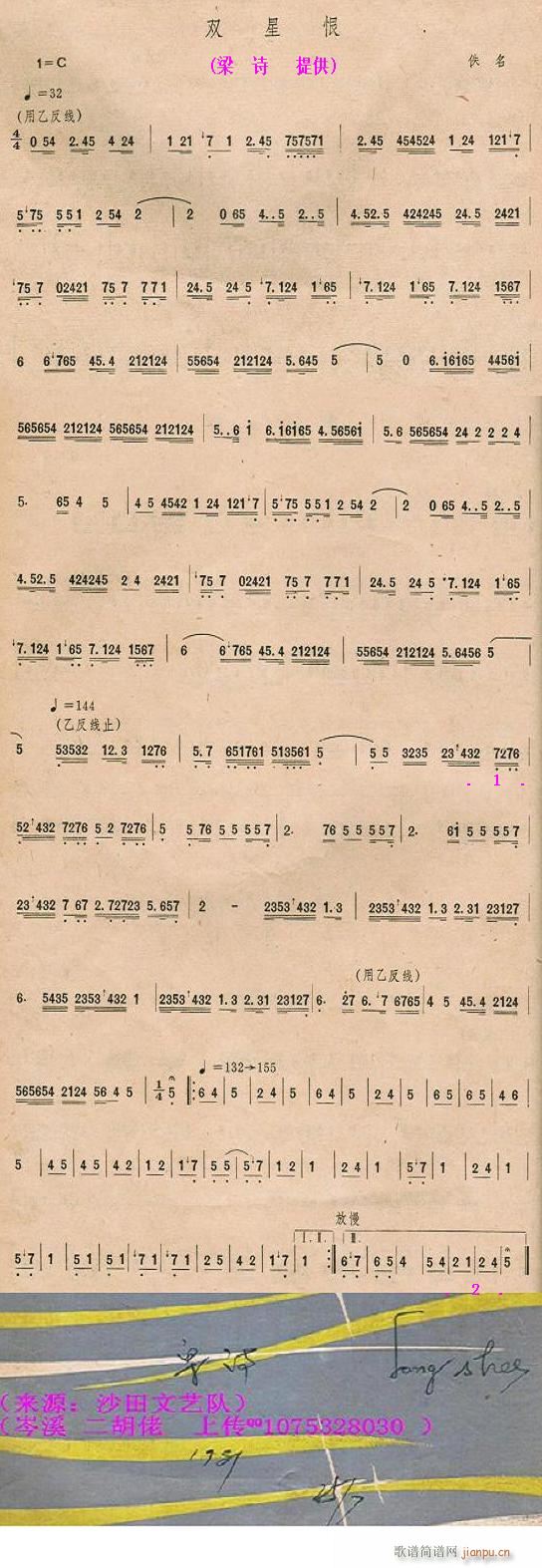 [三字歌谱]广东音乐:双星恨(简谱)