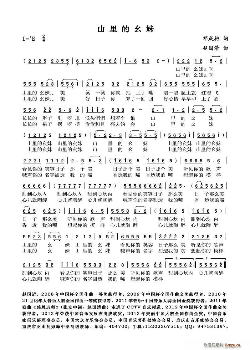 [五字歌谱]敏感的幺妹 曲 巍巍 词 钰花源 (寻演唱老师)