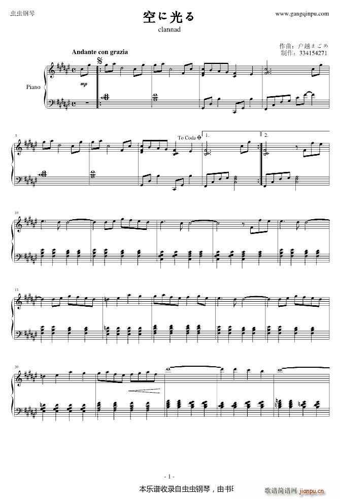 [钢琴谱]空に光る( 插曲) Clannad