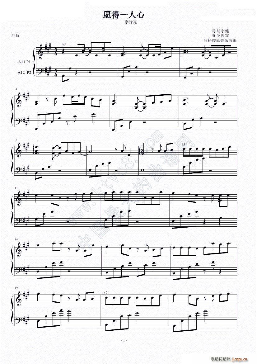 [钢琴谱]愿得一人心-欣仔版 李行亮