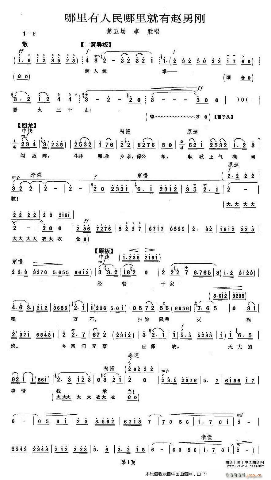 [十字及以上]哪里有人民哪里就有赵勇刚(《平原作战》李胜唱段、琴谱)