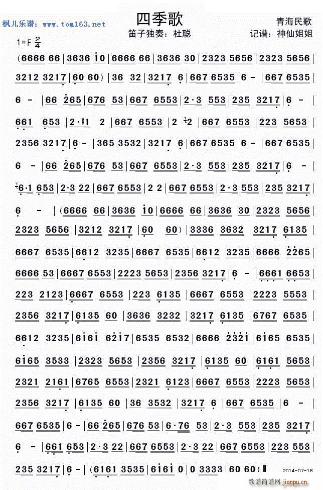 > 四季歌(花儿与少年)笛子独奏谱— (青海民歌)