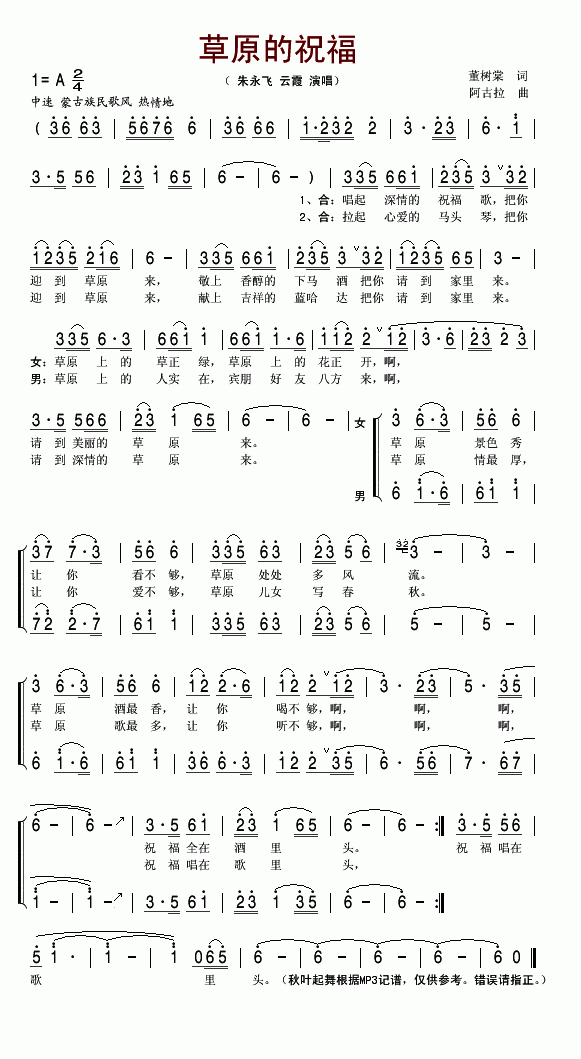[五字歌谱]草原的祝福 朱永飞、云霞