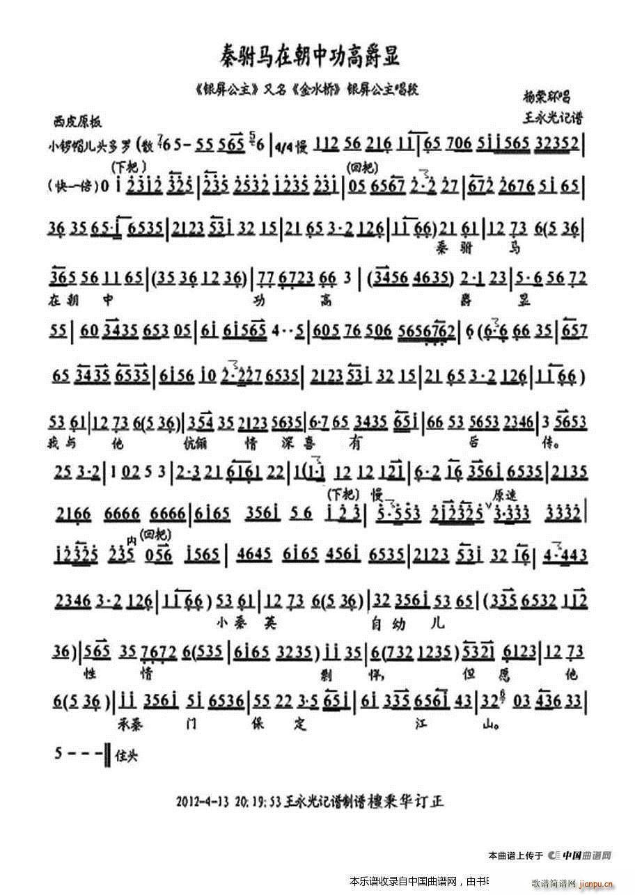 [京剧曲谱]秦驸马在朝中功高爵显(《银屏公主》选段、琴谱) 京剧唱谱 杨荣环
