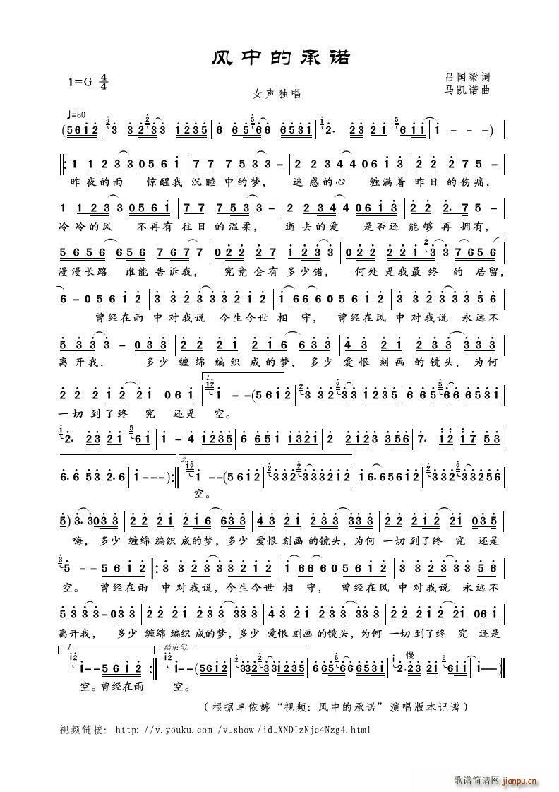 [五字歌谱]风中的承诺 李娜
