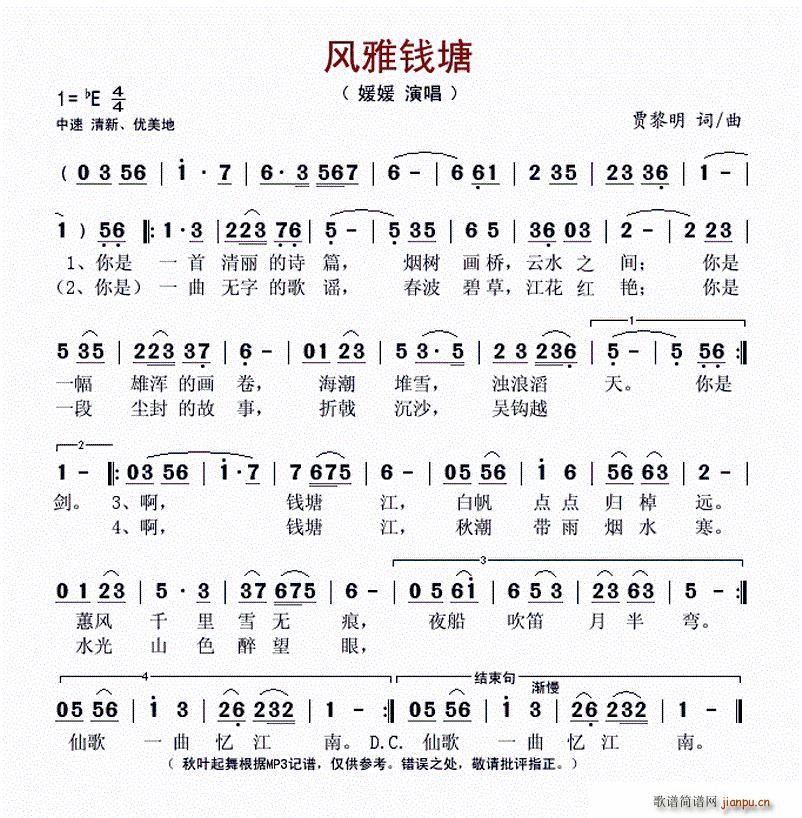 [四字歌谱]钱塘风潮(电视剧《十万人家》片尾曲) 谭晶