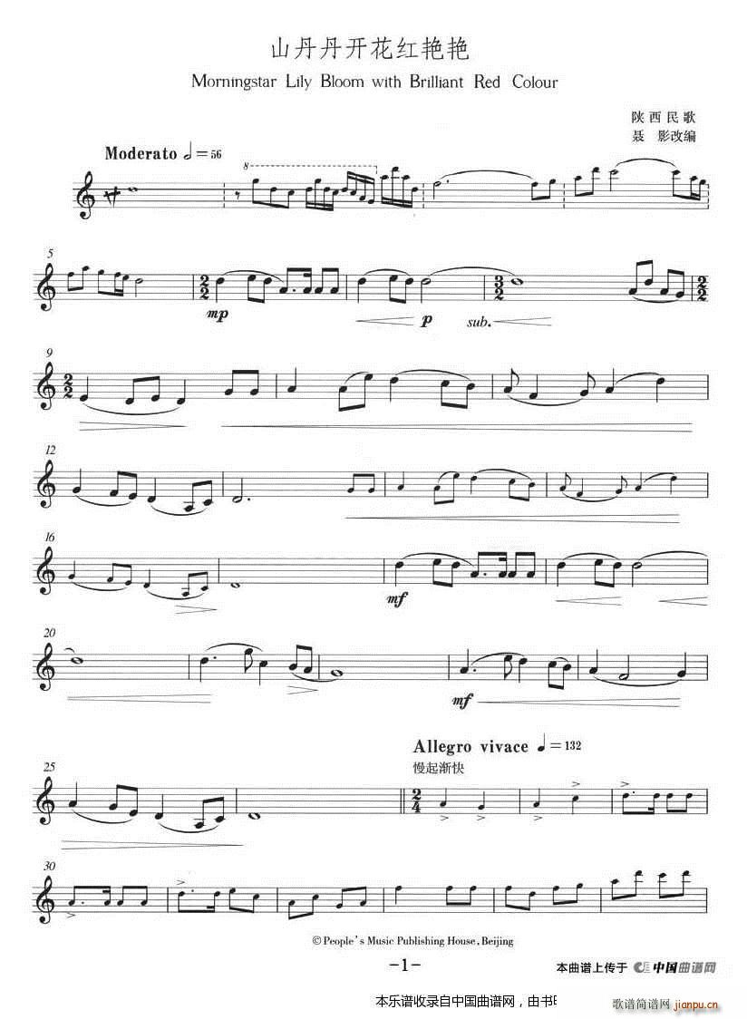 [八字歌谱]山丹丹开花红艳艳(陕甘民歌) 未知