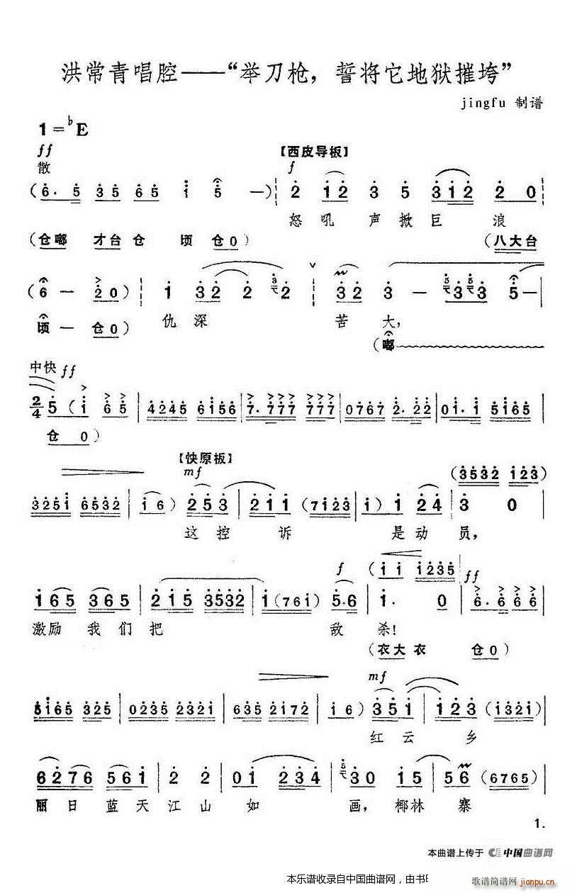 > 举刀枪 誓将它地狱摧垮(《红色娘子军》洪常青唱段) 京剧戏谱