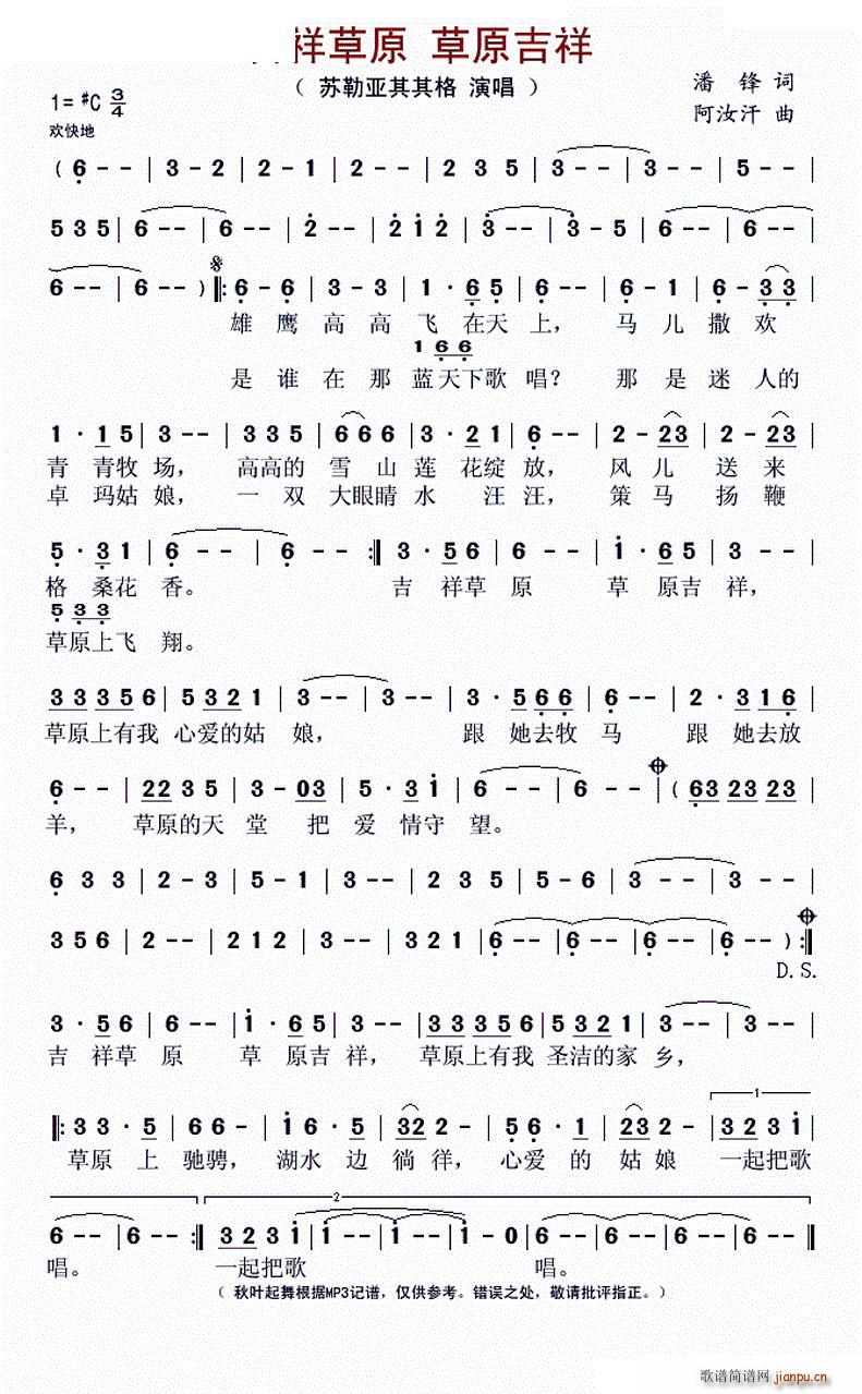 [八字歌谱]吉祥草原(麦莱词 乌震来曲)