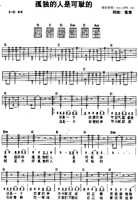 [吉他谱]孤独的人是可耻的—张楚 未知