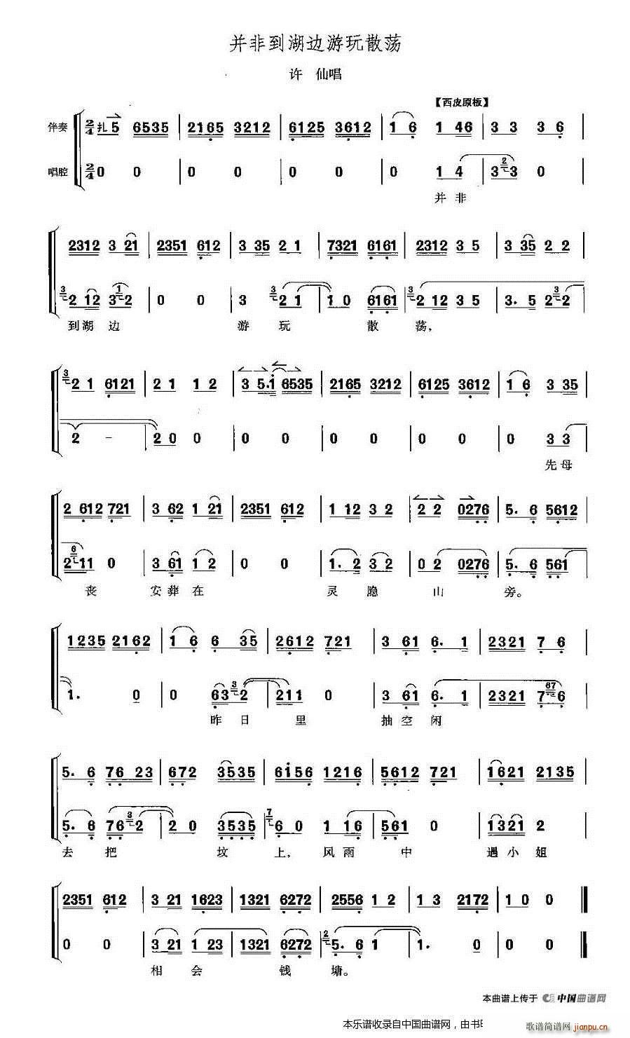 > 并非到湖边游玩散荡(《白蛇传》许仙唱段) 京剧戏谱
