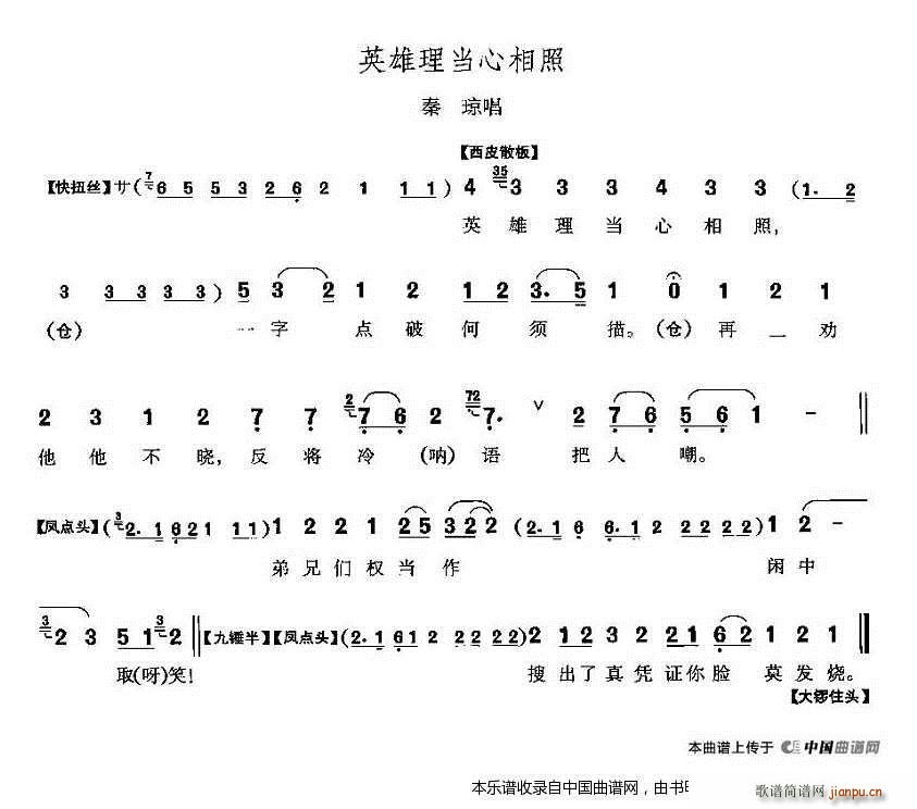 [十字及以上]英雄理当心相照(《响马传》 唱段) 唱谱 秦琼