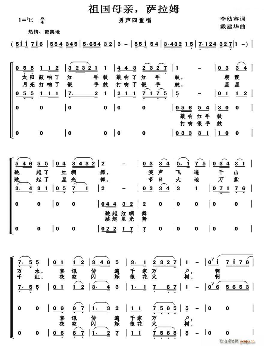 > 祖国母亲 萨拉姆(李幼容词 戴建华曲、男声四重唱)
