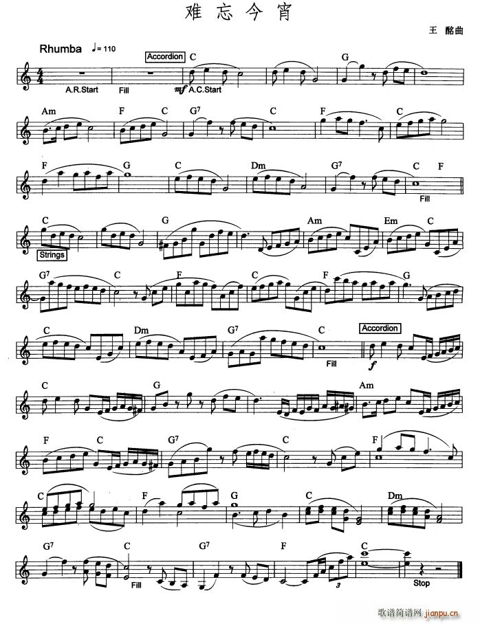 [四字歌谱]难忘今宵(简谱/五线谱对照) 毛阿敏