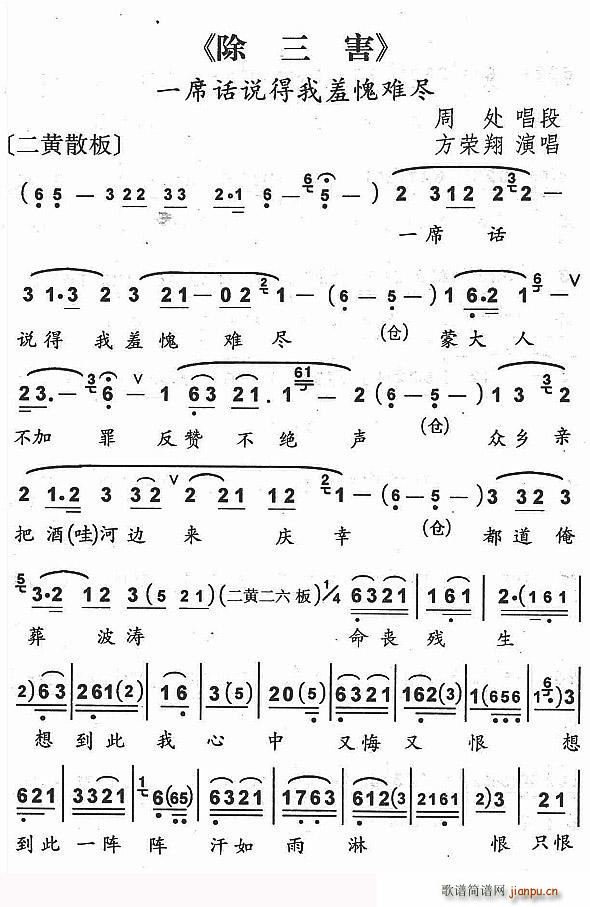 [三字歌谱]除三害 一席话说得我羞愧难尽