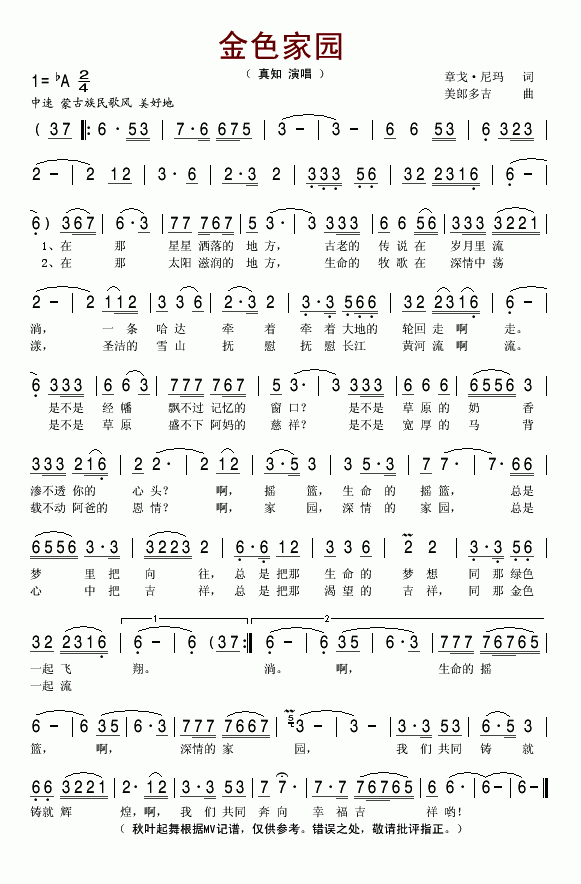 [四字歌谱]金色家园 真知