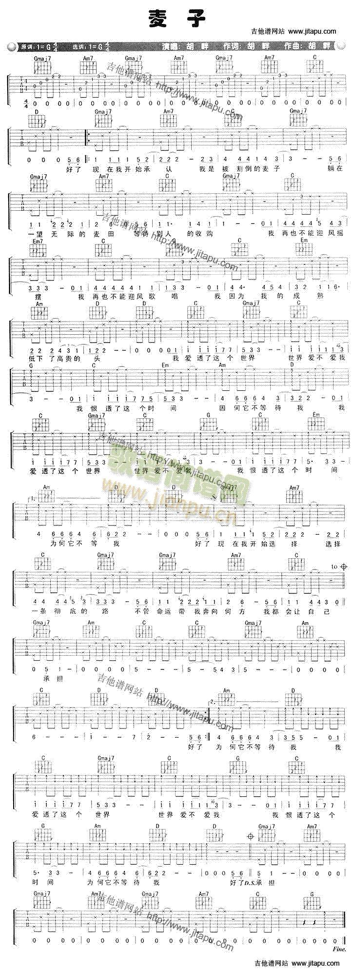 [其他乐谱]麦子-简易版-弹唱 吉他类 流行 胡畔