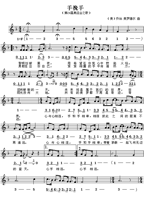 [三字歌谱]手挽手(24届奥运会会歌) 未知