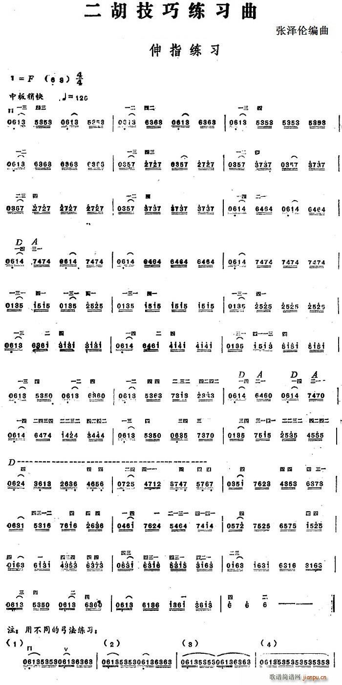 > 二胡技巧练习曲 伸指练习