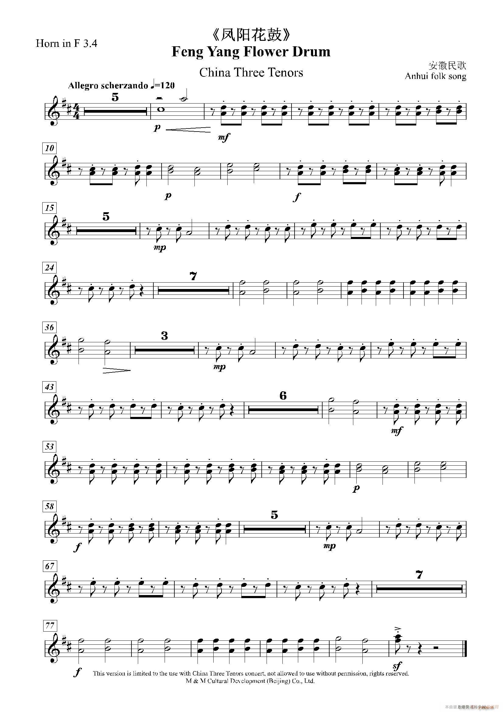 [二胡谱]凤阳花鼓 安徽民歌(简谱五线谱对照)