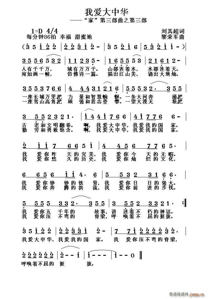 [八字歌谱]我亲我爱的大中华(张枚同词 莫一军曲)