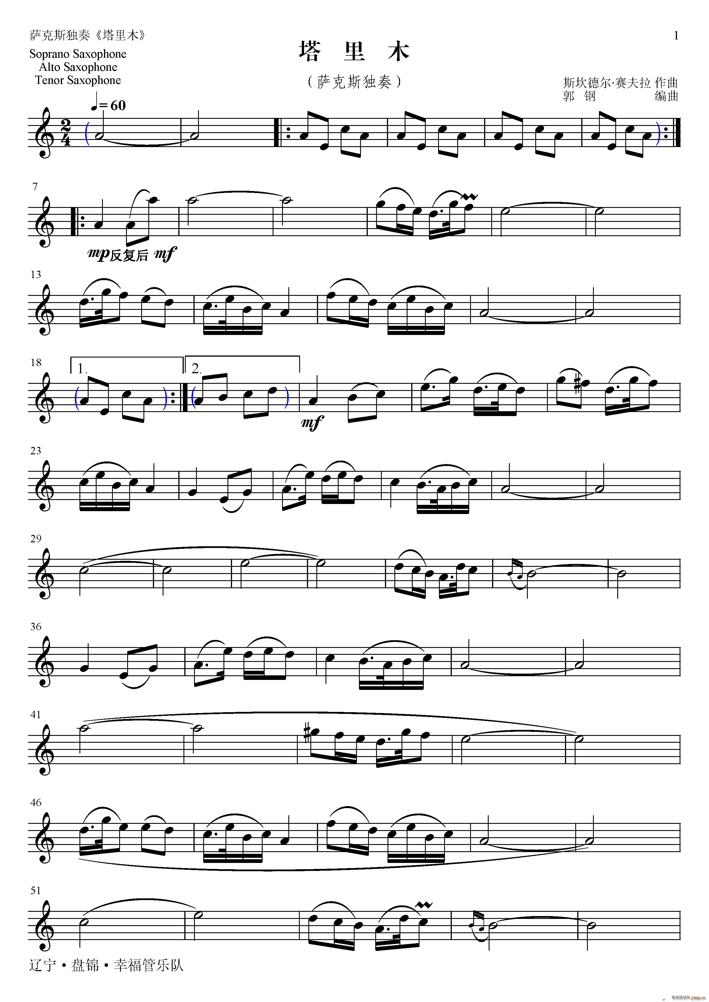 [九字歌谱]萨克斯独奏《塔里木》 辽宁盘锦幸福管乐队