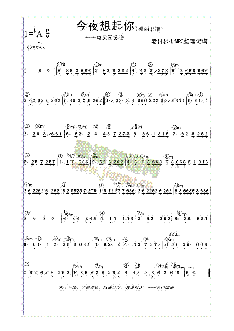[五字歌谱]今夜想起你(电贝司分谱) 邓丽君