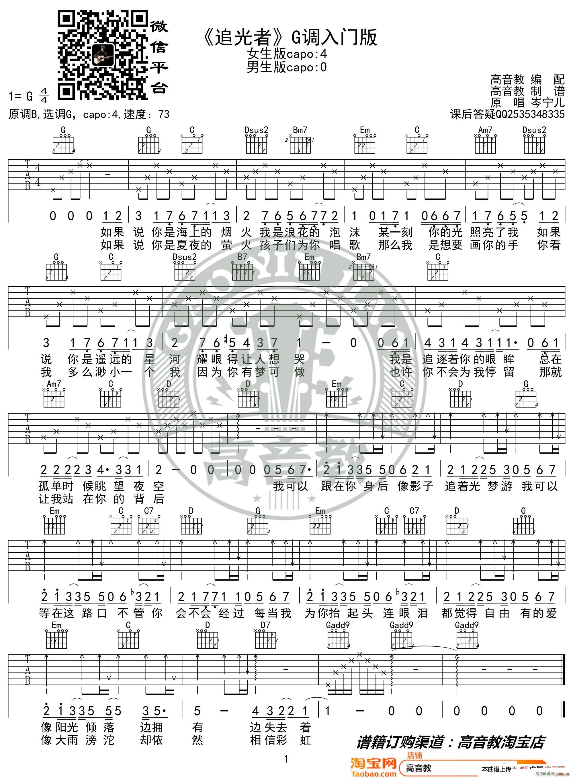 [吉他谱]《追光者》 G调入门版 岑宁儿 编配