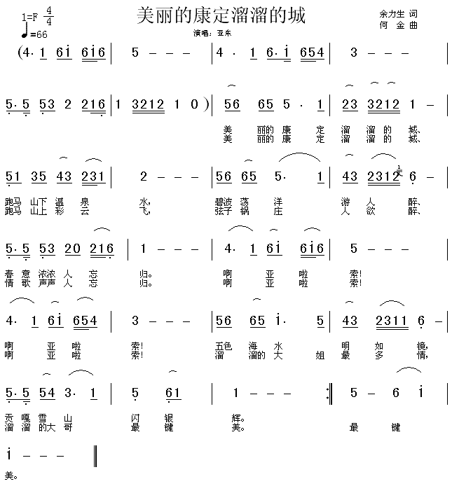 [九字歌谱]美丽的康定溜溜的城 亚东