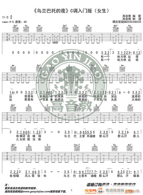 [吉他谱]《乌兰巴托的夜》 C调入门女生版 编配 猴哥吉他教学