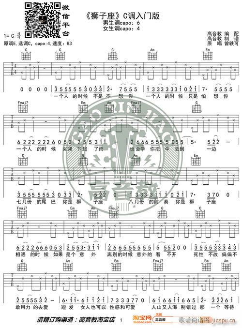 [吉他谱]《狮子座》 C调入门版 编配 猴哥吉他教学