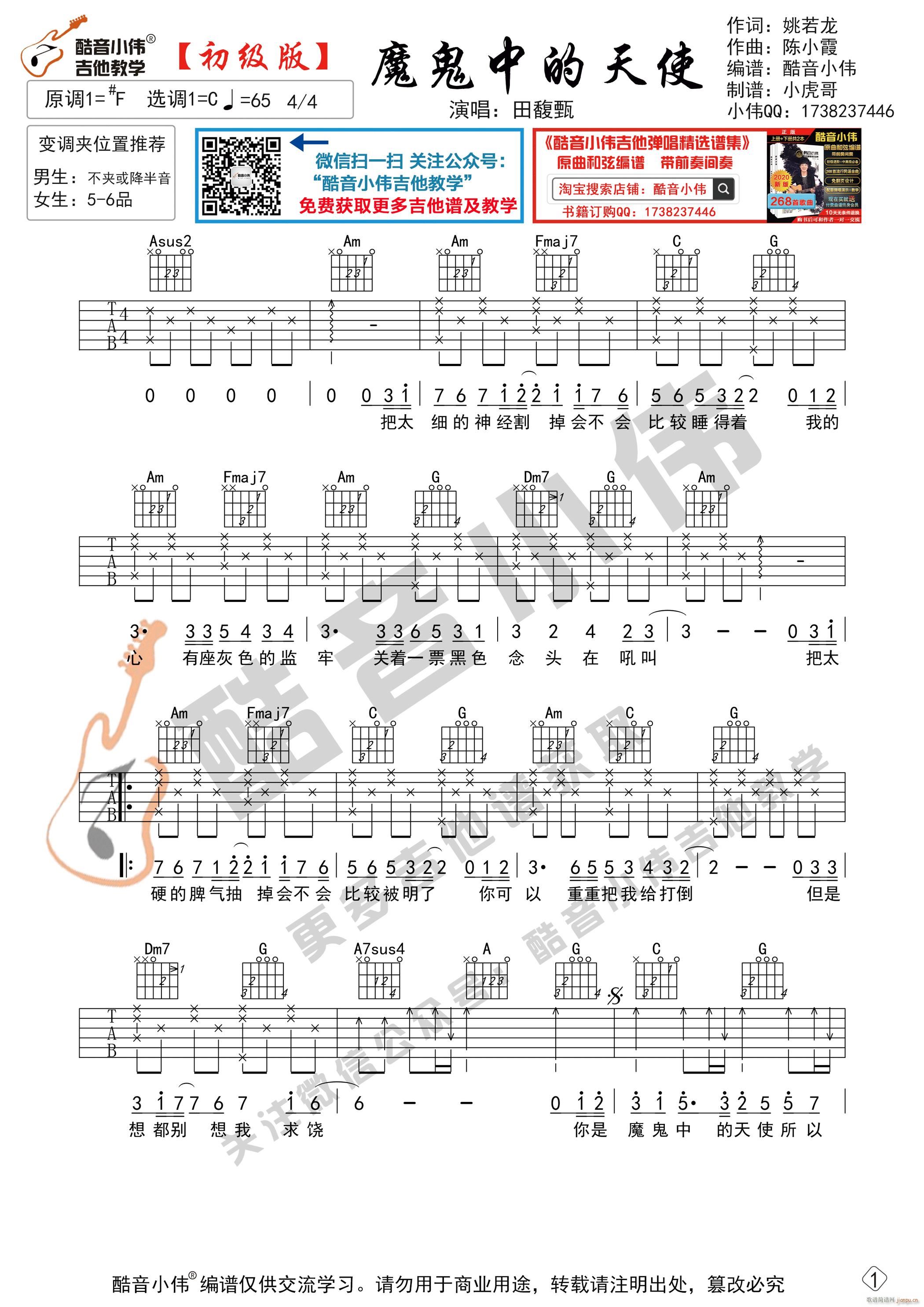 [吉他谱]《魔鬼中的天使》 初级简单版 吉他弹唱教学 田馥甄