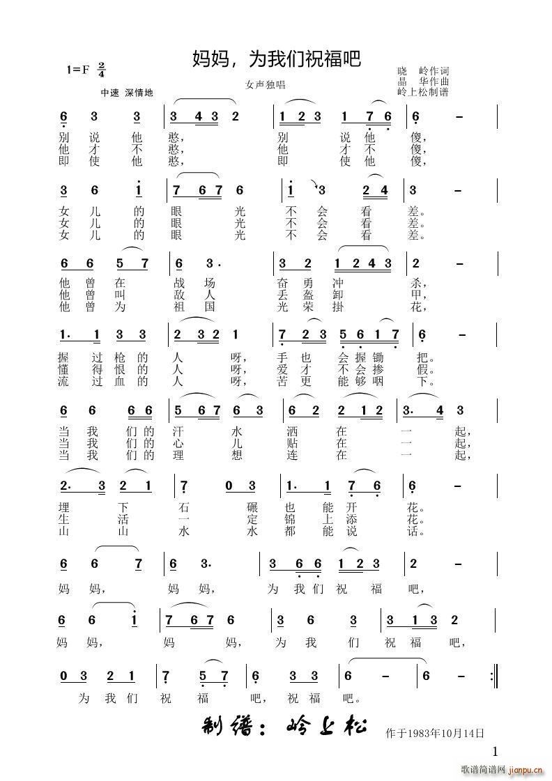 [九字歌谱]妈妈 为我们祝福吧 赵宝祥